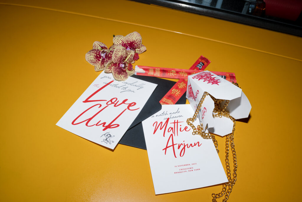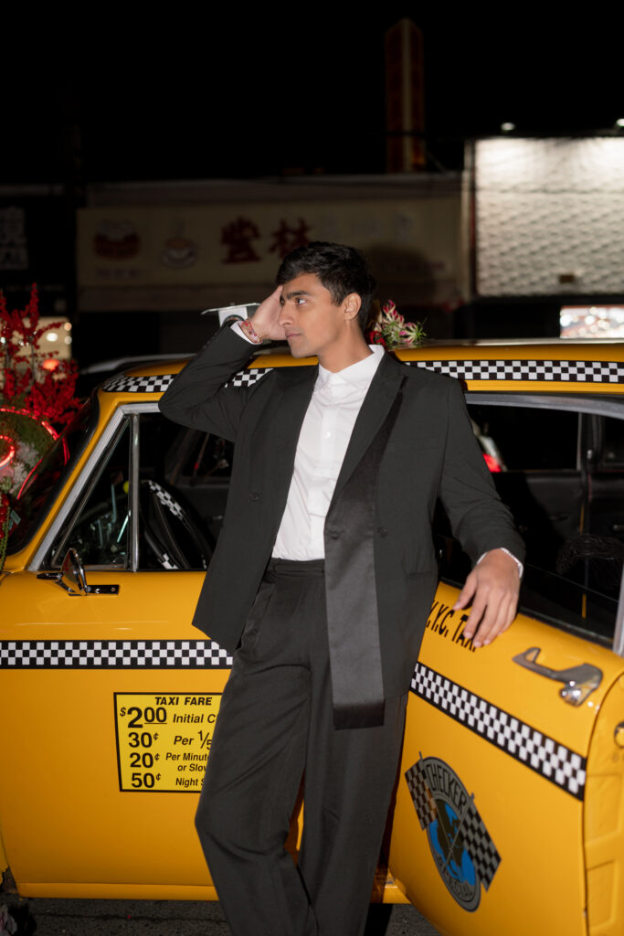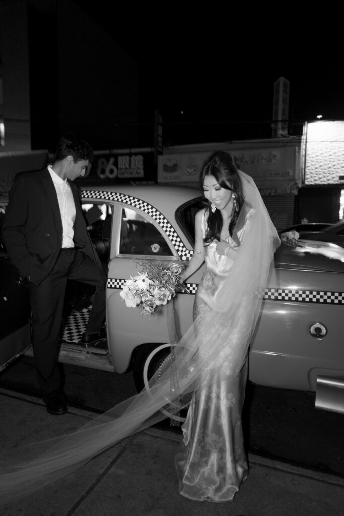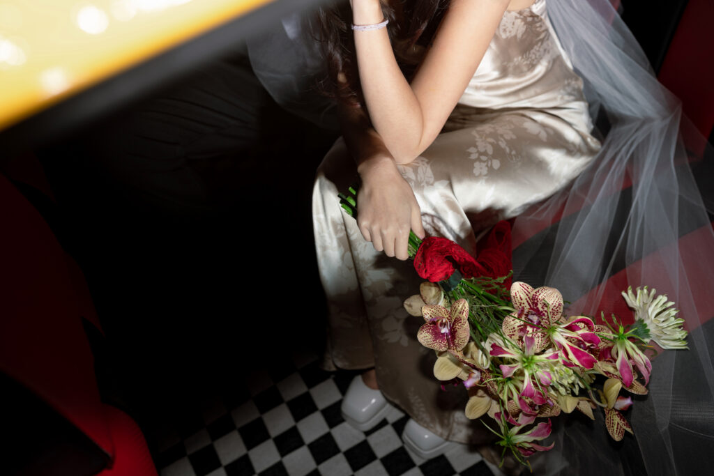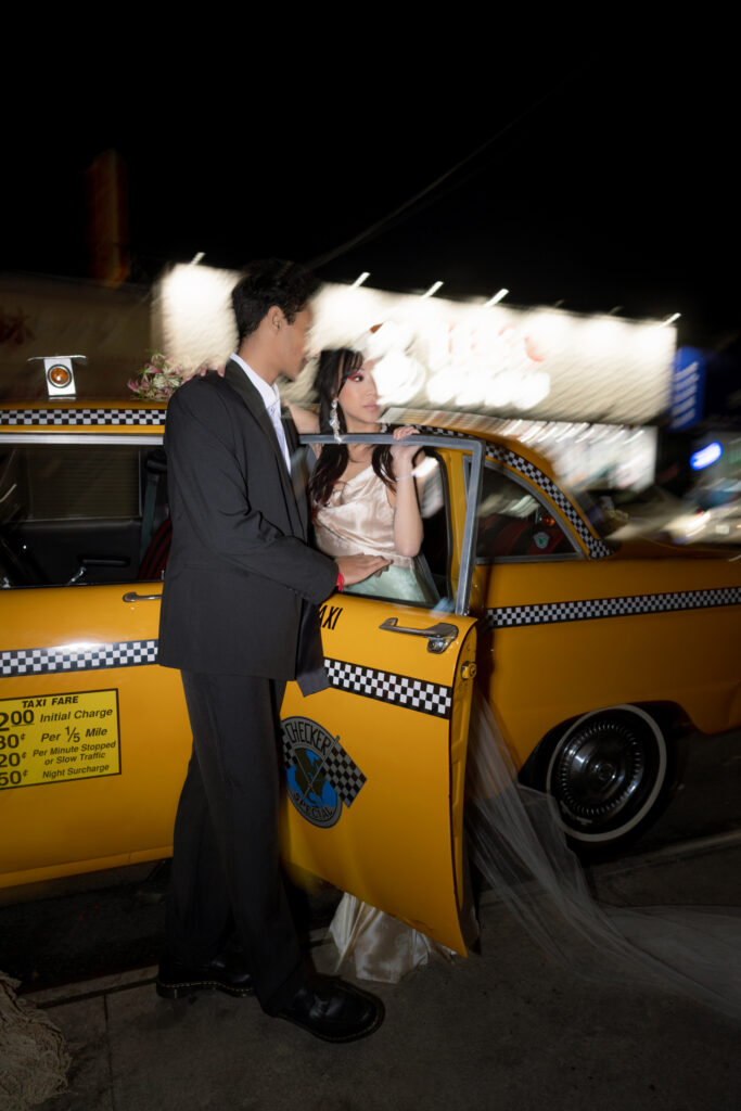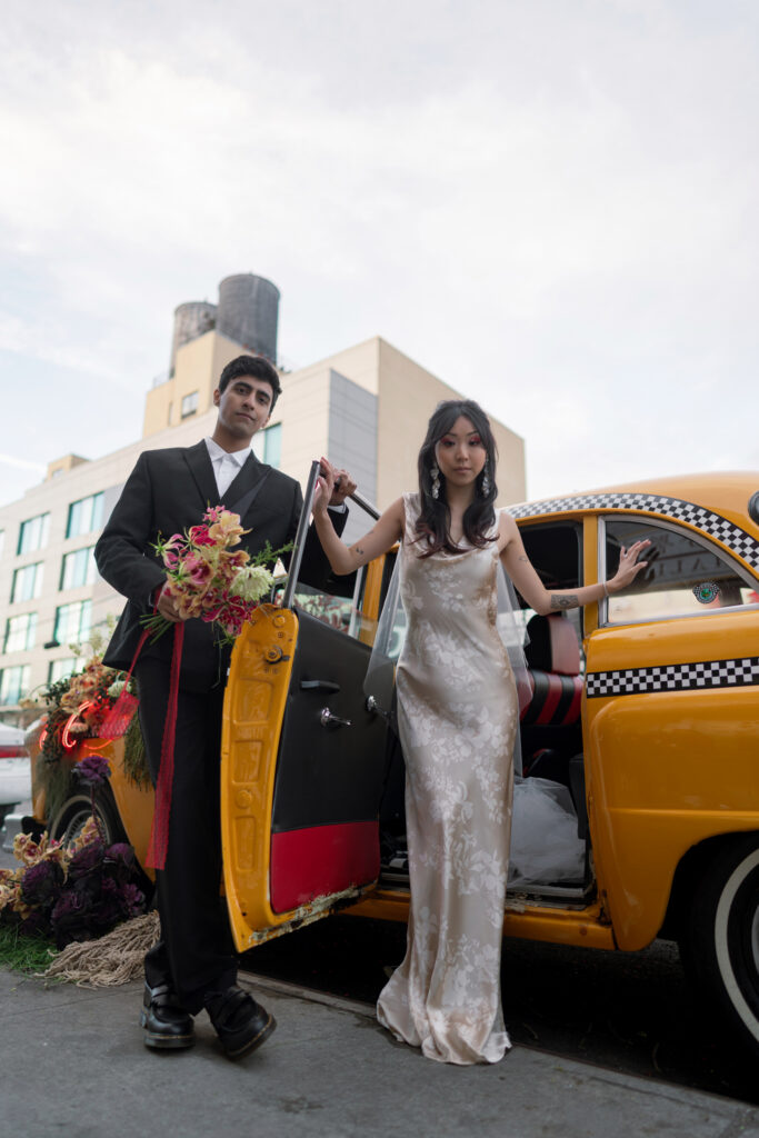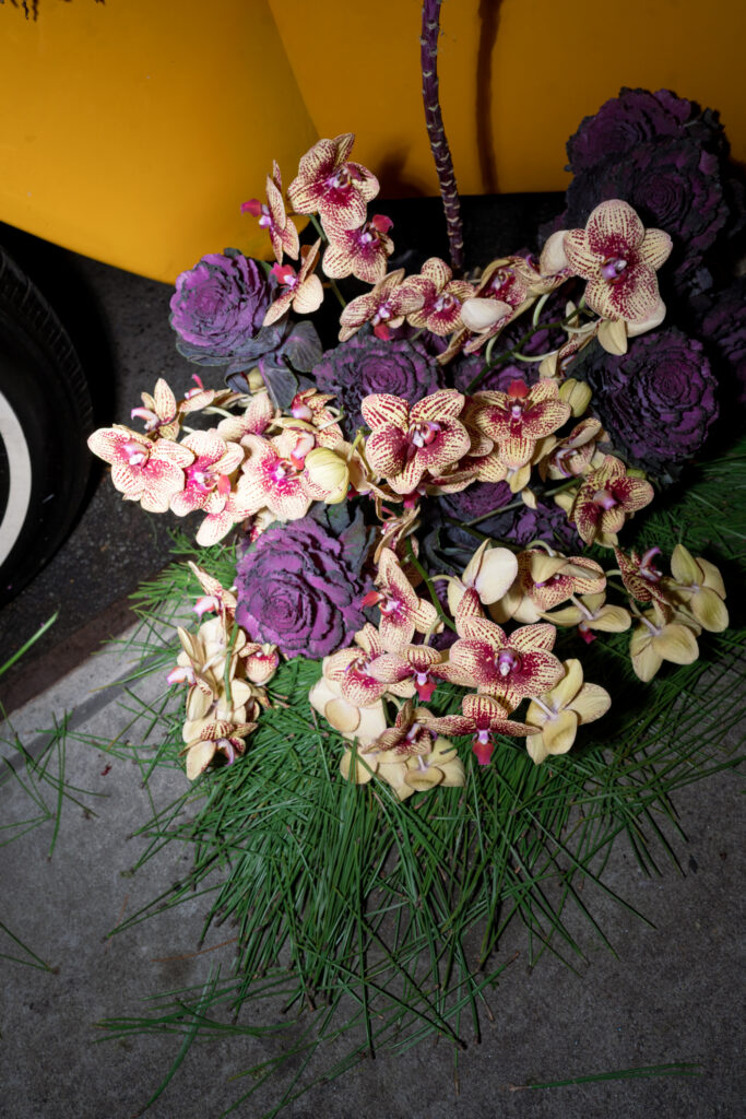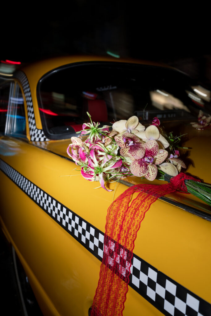 Designed by Flower Disco, the installation didn’t just complement the scene — it transformed it. The checker cab became the set. Draped, layered, and completely reimagined with florals that included unexpected elements like tomatoes woven throughout. It felt sculptural, a little rebellious, and entirely editorial — like something you’d see in a campaign rather than a wedding.